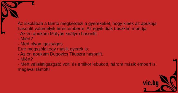 Az iskolában a tanító megkérdezi a gyerekeket, hogy kinek az apukája hasonlít valamelyik híres emberre. Az egyik diák büszkén mondja: