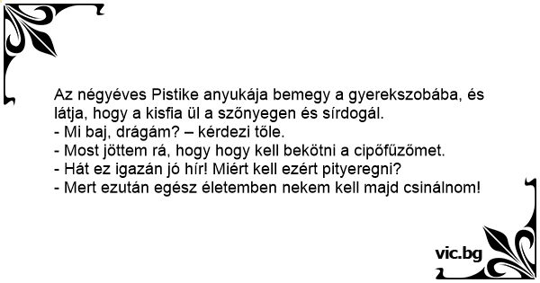 Az négyéves Pistike anyukája bemegy a gyerekszobába, és látja, hogy a kisfia ül a szőnyegen és sírdogál.