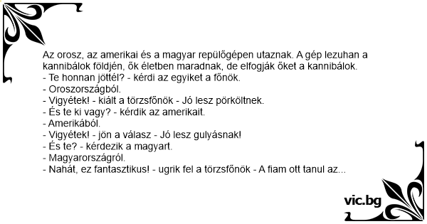 - Nahát, ez fantasztikus! - ugrik fel a törzsfőnök - A fiam ott tanul az egyik magyar egyetemen. Gyere, téged életben hagyunk, sőt, meghívlak vacsorára. Mit kérsz? Pörköltet vagy gulyást?