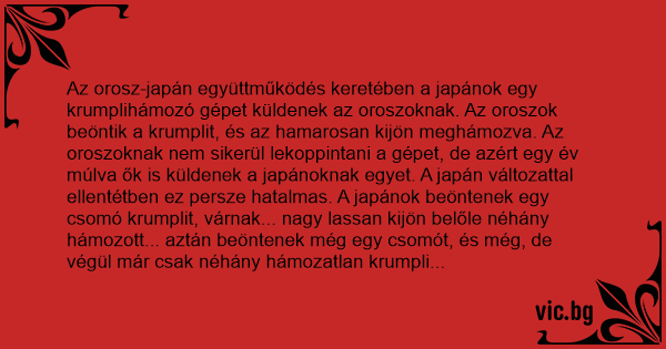 Az orosz-japán együttműködés keretében a japánok egy krumplihámozó gépet küldenek az oroszoknak. Az oroszok beöntik a krumplit, és az hamarosan kijön meghámozva. Az oroszoknak nem sikerül lekoppintani a gépet, de azért egy év múlva ők is küldenek a japánoknak egyet. A japán változattal ellentétben ez persze hatalmas. A japánok beöntenek egy csomó krumplit, várnak... nagy lassan kijön belőle néhány hámozott... aztán beöntenek még egy csomót, és még, de végül már csak néhány hámozatlan krumpli gurul ki belőle. Hívják az oroszokat, hogy mi lehet a baj.