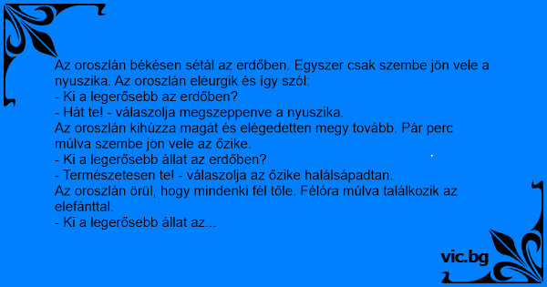 Az oroszlán kihúzza magát és elégedetten megy tovább. Pár perc múlva szembe jön vele az őzike.