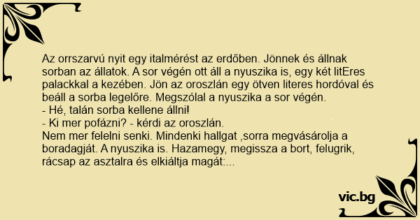 Az orrszarvú nyit egy italmérést az erdőben. Jönnek és állnak sorban az állatok. A sor végén ott áll a nyuszika is, egy két litEres palackkal a kezében. Jön az oroszlán egy ötven literes hordóval és beáll a sorba legelőre. Megszólal a nyuszika a sor végén.