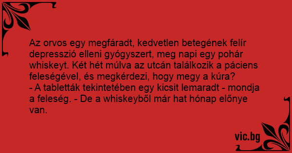 Az orvos egy megfáradt, kedvetlen betegének felír depresszió elleni gyógyszert, meg napi egy pohár whiskeyt. Két hét múlva az utcán találkozik a páciens feleségével, és megkérdezi, hogy megy a kúra?