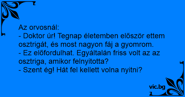 - Doktor úr! Tegnap életemben először ettem osztrigát, és most nagyon fáj a gyomrom.