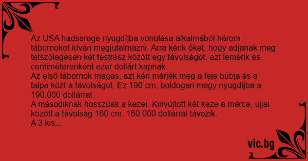Az első tábornok magas, azt kéri mérjék meg a feje búbja és a talpa közt a távolságot. Ez 190 cm, boldogan megy nyugdíjba a 190.000 dollárral.