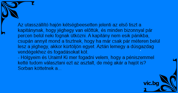 Az utasszállító hajón kétségbeesetten jelenti az első tiszt a kapitánynak, hogy jéghegy van előttük, és minden bizonnyal pár percen belül neki fognak ütközni. A kapitány nem esik pánikba, csupán annyit mond a tisztnek, hogy ha már csak pár méteren belül lesz a jéghegy, akkor kürtöljön egyet. Aztán lemegy a dúsgazdag vendégekhez és fogadásokat köt.