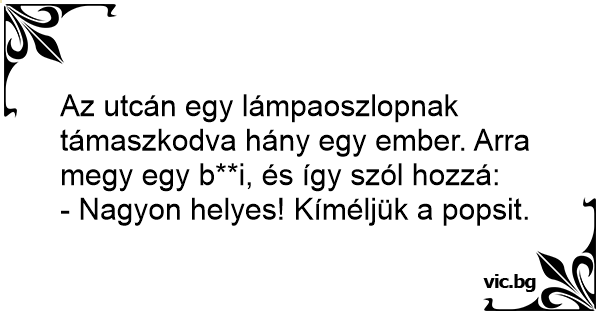 Az utcán egy lámpaoszlopnak támaszkodva hány egy ember. Arra megy egy b**i, és így szól hozzá: