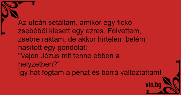 Astazi, mergand pe strada, am gasit 50 de lei. Ca un bun crestin, m-am intrebat: "Ce ar fi facut Iisus?" Asa ca i-am transformat in vin. Doua sticle.