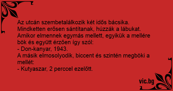 Az utcán szembetalálkozik két idős bácsika. Mindketten erősen sántítanak, húzzák a lábukat. Amikor elmennek egymás mellett, egyikük a mellére bök és együtt érzően így szól: