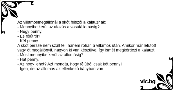 A skót persze nem száll fel, hanem rohan a villamos után. Amikor már lefutott vagy öt megállónyit, nagyon ki van készülve, így ismét megkérdezi a kalauzt: