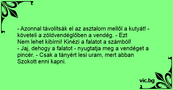 - Azonnal távolítsák el az asztalom mellől a kutyát! - követeli a zöldvendéglőben a vendég. - Ezt