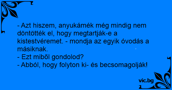 - Azt hiszem, anyukámék még mindig nem döntötték el, hogy megtartják-e a kistestvéremet. - mondja az egyik óvodás a másiknak.