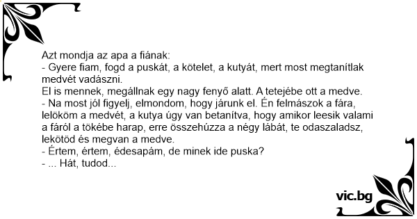- ... Hát, tudod azért fiam, mert ha netán a medve lökne le engem, akkor te fogd a puskát és lődd le a kutyát.