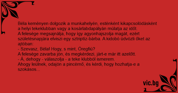 Béla keményen dolgozik a munkahelyén, esténként kikapcsolódásként a helyi tekeklubban vagy a kosárlabdapályán múlatja az időt.