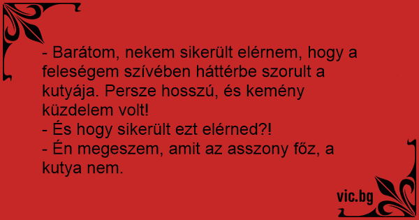 - Barátom, nekem sikerült elérnem, hogy a feleségem szívében háttérbe szorult a kutyája. Persze hosszú, és kemény küzdelem volt!