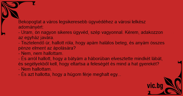 - Uram, ön nagyon sikeres ügyvéd, szép vagyonnal. Kérem, adakozzon az egyház javára.