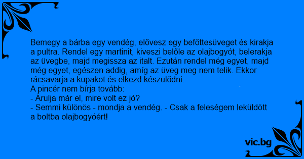 - Semmi különös - mondja a vendég. - Csak a feleségem leküldött a boltba olajbogyóért!