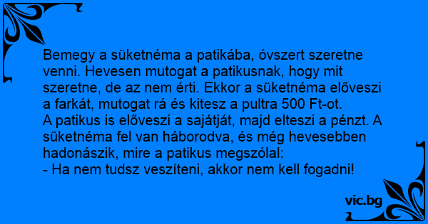 Bemegy a süketnéma a patikába, óvszert szeretne venni. Hevesen mutogat a patikusnak, hogy mit szeretne, de az nem érti. Ekkor a süketnéma előveszi a farkát, mutogat rá és kitesz a pultra 500 Ft-ot.