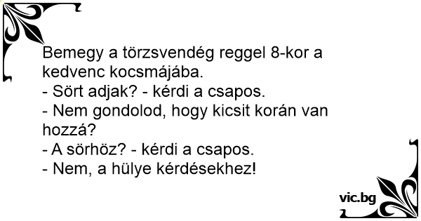 Bemegy a törzsvendég reggel 8-kor a kedvenc kocsmájába.