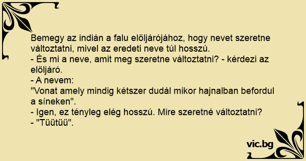 Bemegy az indián a falu elöljárójához, hogy nevet szeretne változtatni, mivel az eredeti neve túl hosszú.