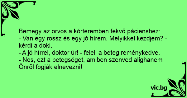 - Kedves beteg! Van egy jó hírem, és egy rossz. Melyikkel kezdjem? - Kezdje a rossz hírrel, doki! - Ön olyan betegséget kapott, amit sajnos még nem ismer a mai orvostudomány! - És mi a jó hír? - Ha...