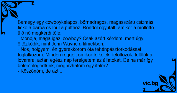 Egy cowboy bent iszogat a bárban, odalép hozzá egy nő és megkérdi: - Te igazi cowboy vagy? - Igen! - válaszolja a cowboy. - És mit csinál egy cowboy? - Reggeltől estig vigyáz a csordájára, majd...