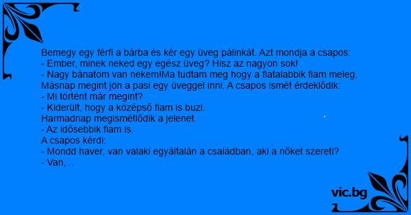 Másnap megint jön a pasi egy üveggel inni. A csapos ismét érdeklődik: