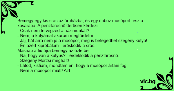 Bemegy egy kis srác az áruházba, és egy doboz mosóport tesz a kosarába. A pénztárosnő derűsen kérdezi: