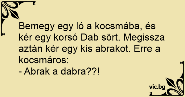 Bemegy egy ló a kocsmába, és kér egy korsó Dab sört. Megissza aztán kér egy kis abrakot. Erre a kocsmáros: