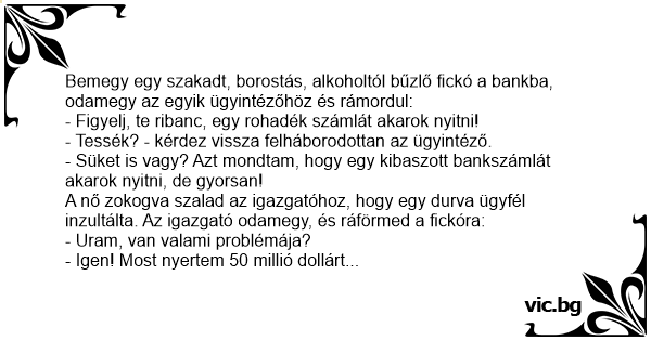 Bemegy egy szakadt, borostás, alkoholtól bűzlő fickó a bankba, odamegy az egyik ügyintézőhöz és rámordul: