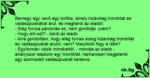- Egyformán viszik mindkettőt, - mondja az eladó - ahányszor eladunk egy trombitát, hamarosan megjelenik egy szomszéd vadászpuskát keresve.