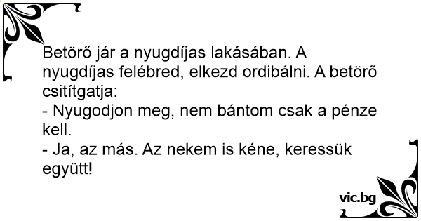 Betörő jár a nyugdíjas lakásában. A nyugdíjas felébred, elkezd ordibálni. A betörő csitítgatja: