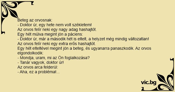 Egy hét elteltével megint jön a beteg, és ugyanarra panaszkodik. Az orvos elgondolkodik: