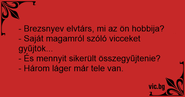 Leonyid Brezsnyevet egyszer megkérdezte egy egy riporter: - Mondja Brezsnyev elvtárs, mi az ön hobbija? - Rólam szóló vicceket gyűjtök. - És sok van? - Hogyne, már 2 láger tele van velük.