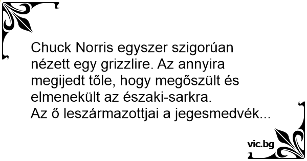 Chuck Norris egyszer szigorúan nézett egy grizzlire. Az annyira megijedt tőle, hogy megőszült és elmenekült az északi-sarkra.