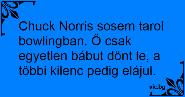 Chuck Norris sosem tarol bowlingban. Ő csak egyetlen bábut dönt le, a többi kilenc pedig elájul.
