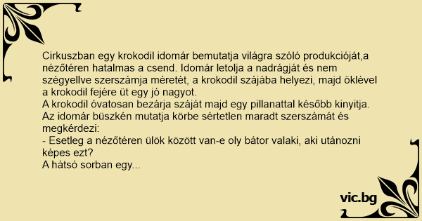 Cirkuszban egy krokodil idomár bemutatja világra szóló produkcióját,a nézőtéren hatalmas a csend. Idomár letolja a nadrágját és nem szégyellve szerszámja méretét, a krokodil szájába helyezi, majd öklével a krokodil fejére üt egy jó nagyot.