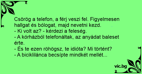Csörög a telefon, a férj veszi fel. Figyelmesen hallgat és bólogat, majd nevetni kezd.