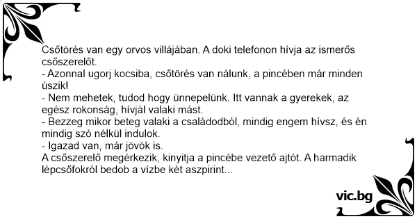 Egy orvos az éjszaka közepén felkel és kimegy a vécére. Meglepődve látja, hogy eldugult a toalett. Felébreszti a feleségét: - Drágám, eldugult a vécé, hívjuk ki a vízszerelőt! - Megőrültél? Hajnali...