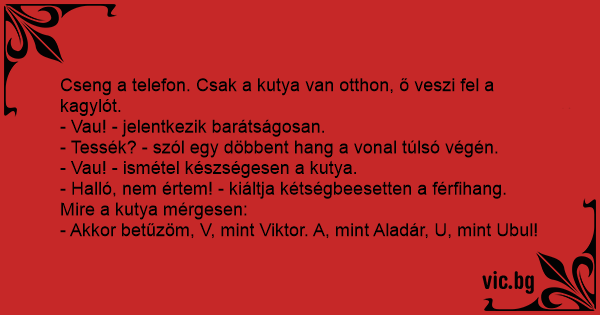 Cseng a telefon. Csak a kutya van otthon, ő veszi fel a kagylót.