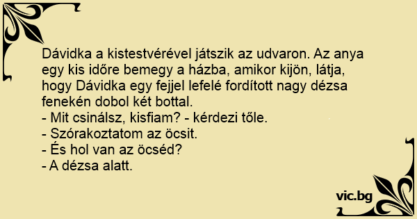 Dávidka a kistestvérével játszik az udvaron. Az anya egy kis időre bemegy a házba, amikor kijön, látja, hogy Dávidka egy fejjel lefelé fordított nagy dézsa fenekén dobol két bottal.