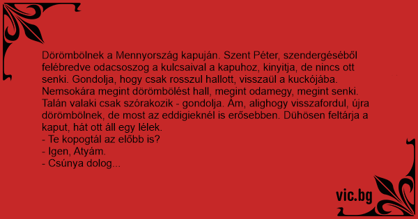 Dörömbölnek a Mennyország kapuján. Szent Péter, szendergéséből felébredve odacsoszog a kulcsaival a kapuhoz, kinyitja, de nincs ott senki. Gondolja, hogy csak rosszul hallott, visszaül a kuckójába.