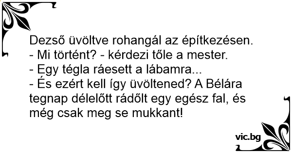 - És ezért kell így üvöltened? A Bélára tegnap délelőtt rádőlt egy egész fal, és még csak meg se mukkant!