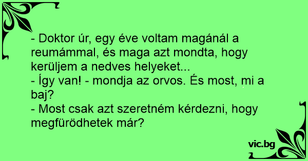 - Doktor úr, egy éve voltam magánál a reumámmal, és maga azt mondta, hogy kerüljem a nedves helyeket...
