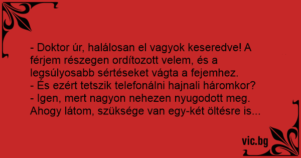 - Doktor úr, halálosan el vagyok keseredve! A férjem részegen ordítozott velem, és a legsúlyosabb sértéseket vágta a fejemhez.