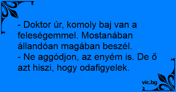 - Doktor úr, komoly baj van a feleségemmel. Mostanában állandóan magában beszél.