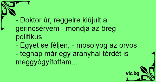- Doktor úr, reggelre kiújult a gerincsérvem - mondja az öreg politikus.