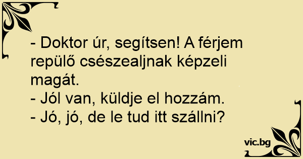 - Doktor úr, segítsen! A férjem repülő csészealjnak képzeli magát.
