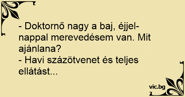 - Doktornő nagy a baj, éjjel-nappal merevedésem van. Mit ajánlana?