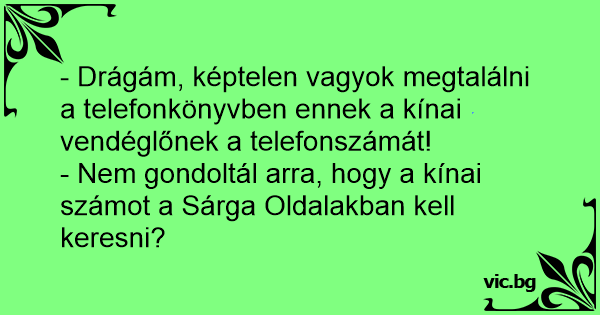 - Drágám, képtelen vagyok megtalálni a telefonkönyvben ennek a kínai vendéglőnek a telefonszámát!